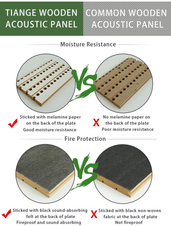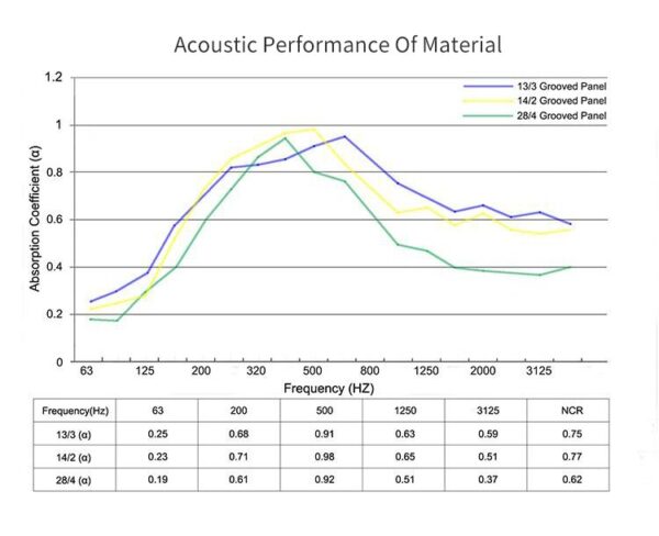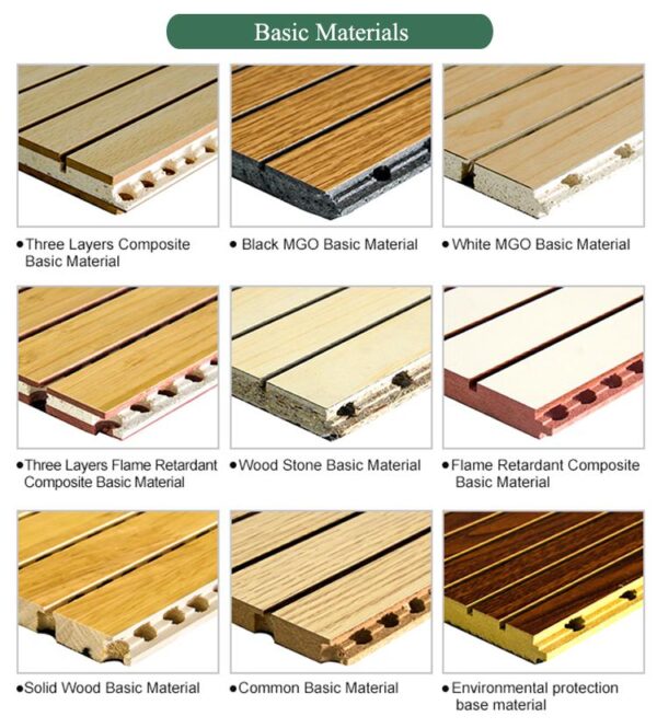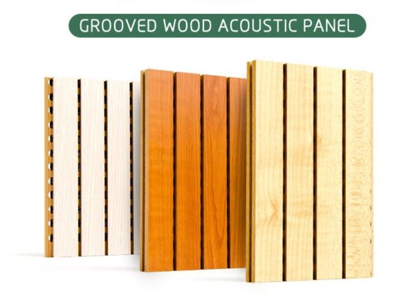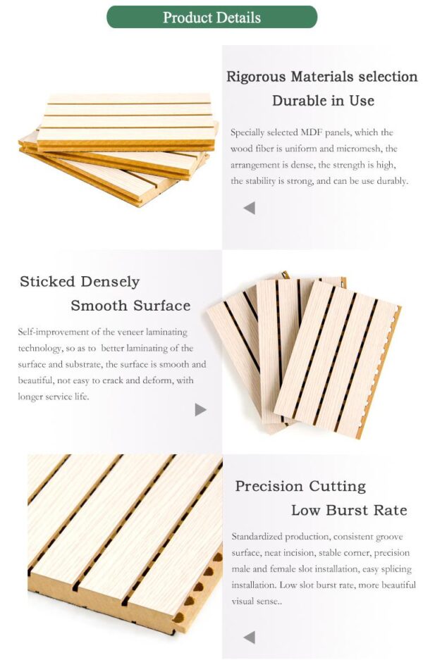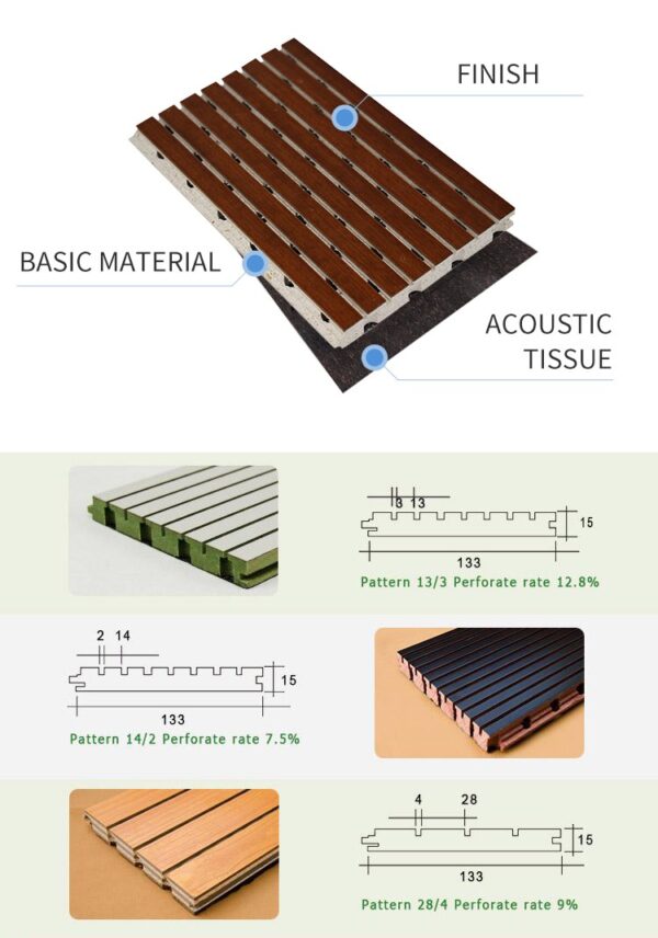 1> Grooved Wooden Acoustic Panels is a kind of slit resonance absorption material which is made from high density panel with grooves on the surface and perforated holes at the back side.