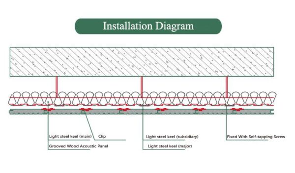 5> If install the acoustic panel in the horizontal way, then the notch of the panel should face down, and it need to be fixed tight with clips. After that install pieces and pieces of acoustic panel onto the lowest one.