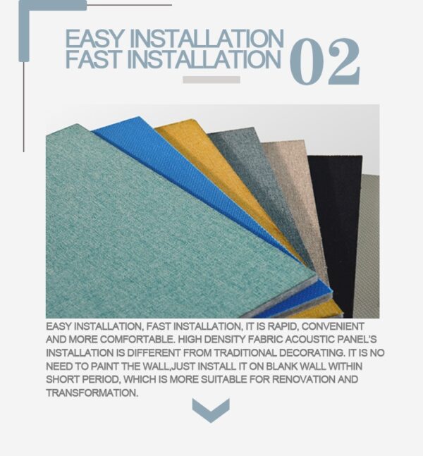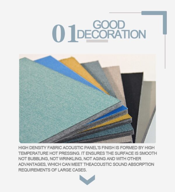 High density fabric acoustic panel’s finish is formed by high temperature hot pressing. it ensures the surface is smooth not bubbling, not wrinkling, not aging and with other advantages, which can meet theacoustic sound absorption requirements of large cases.