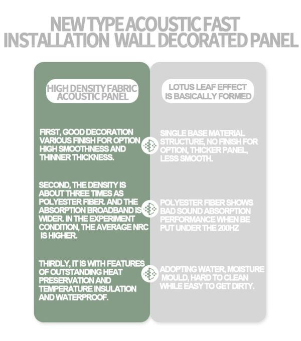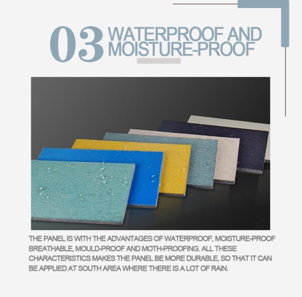 The high density fabric acoustic panel is wtth the advantages of waterproof, moisture-proof breathable, mould-proof and moth-proofing. all these characteristics makes the panel be more durable, so that it can beapplied at south area where there is alot of rain.