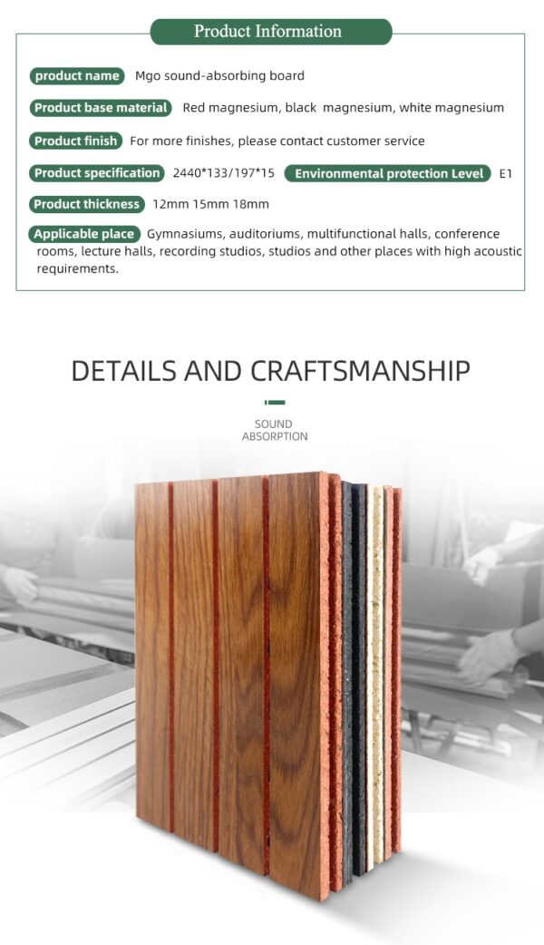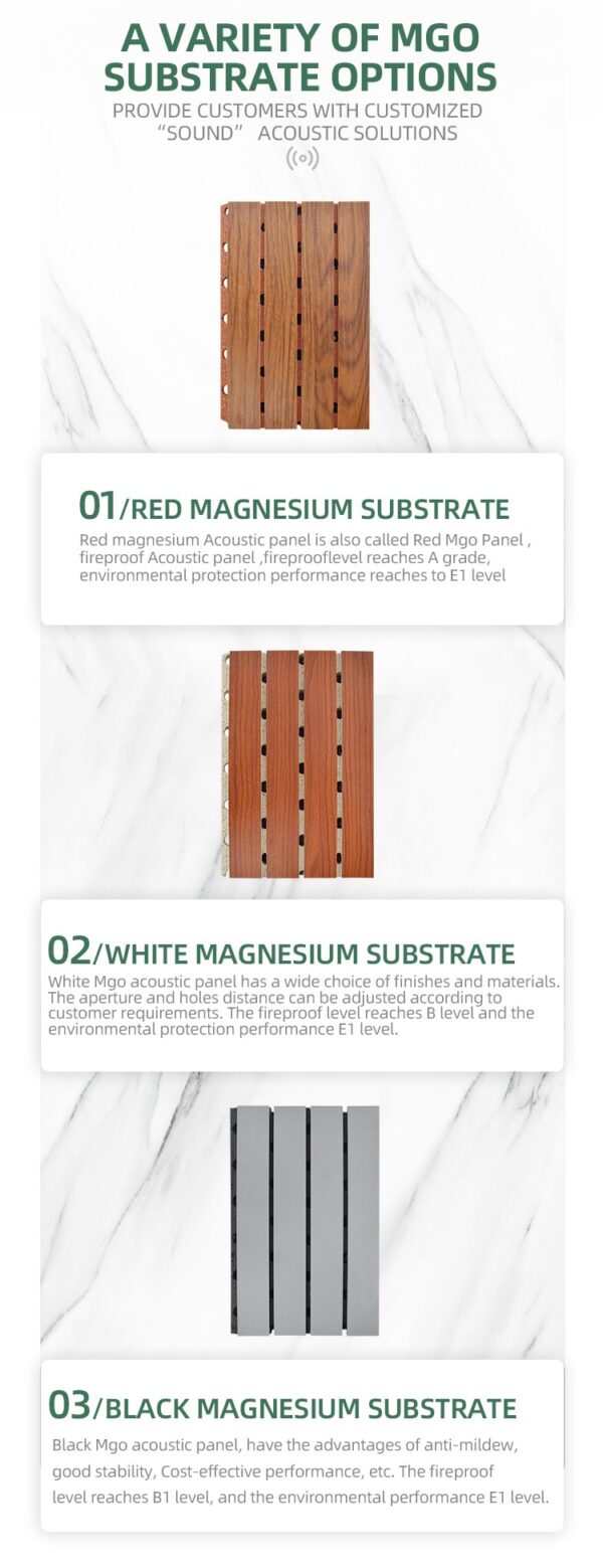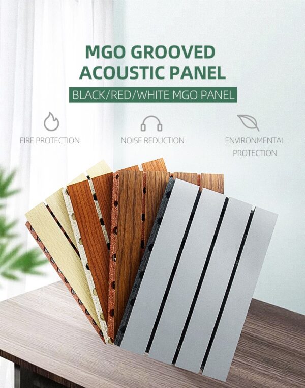 The Mgo Grooved Acoustic Panel is a kind of resonance sound-absorbing material with slits on the front of the Mgo and perforated on the back.
