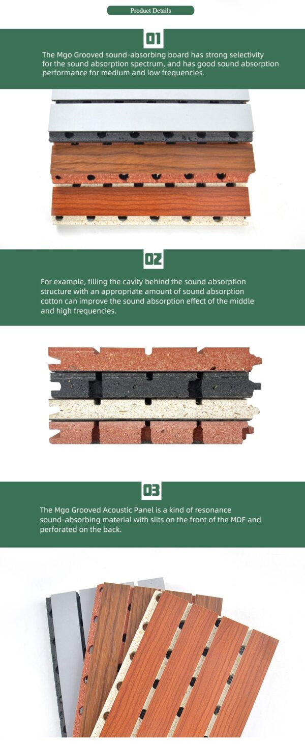 The Mgo Grooved Acoustic Panel has strong selectivity for the sound absorption spectrum, and has good sound absorption performance for medium and low frequencies.Filling the cavity behind the sound absorption structure with an appropriate amount of sound absorption cotton can improve the sound absorption effect of the middle and high frequencies.