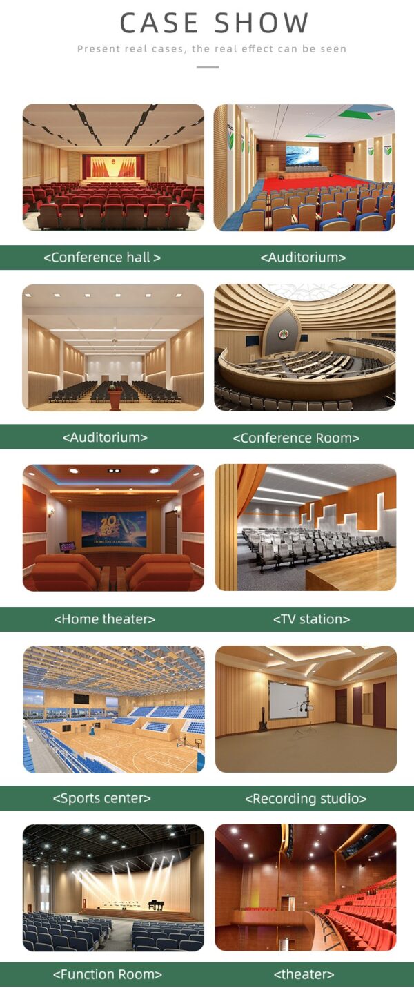 Applicable place: Gymnasiums, auditoriums, multifunctional halls, conference rooms, lecture halls, recording studios, studios and other places with high acoustic requirements.
