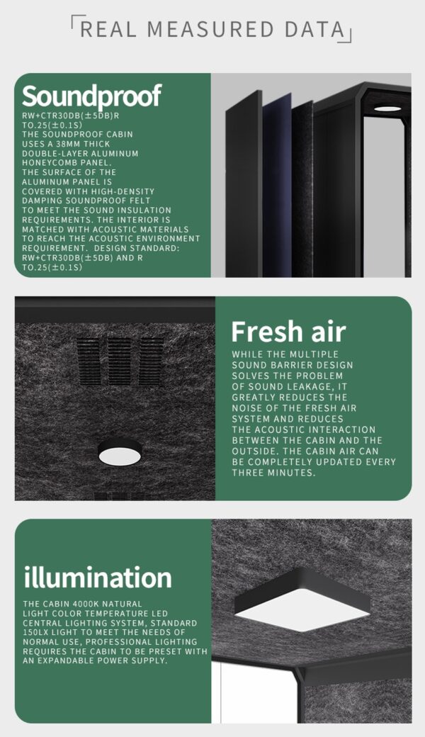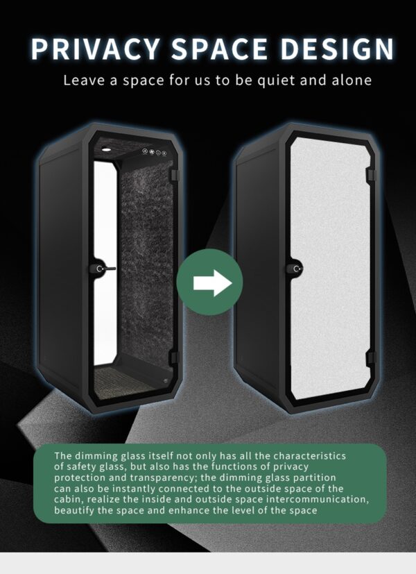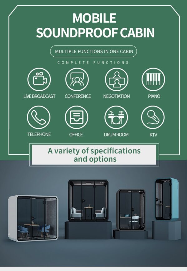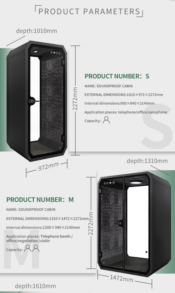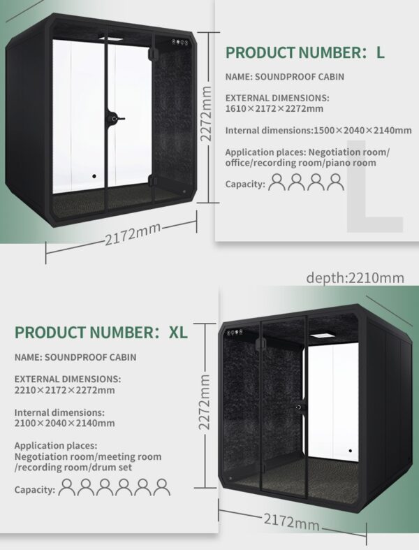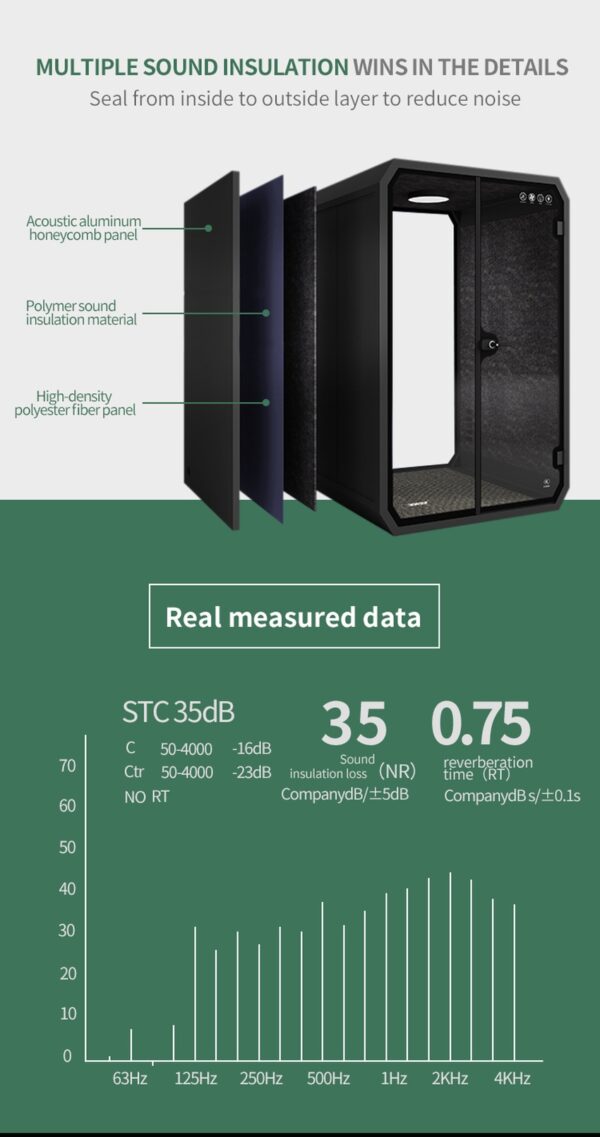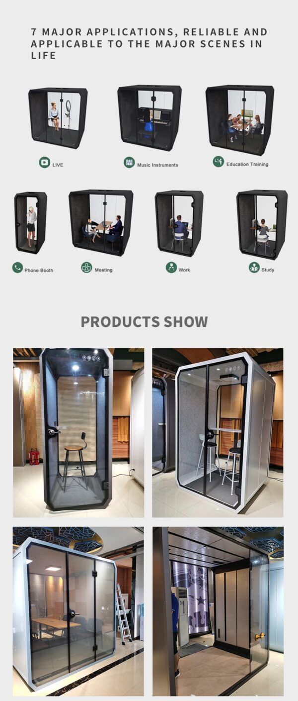 You will find that our soundproof booths greatly reduce noise from the inside to outside and vice versa. Achieving Soundproof Density and independent components are the most important contributing factors to achieve a soundproof booth.